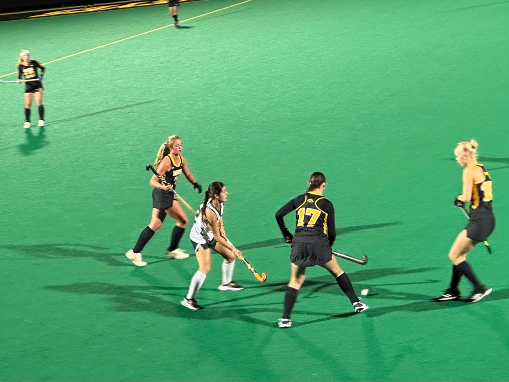 Before long in the first quarter, Iowa struck, with a pass in the second minute from Byers to van Cleef that yielded a field goal. And van Cleef scored again in the three minutes later with a lovely reverse stick backhand shot. Ten minutes in Iowa’s van Kessel got a shot which was blocked and a few seconds later Rachel Herbine got another that was saved by the Lyra Gravino the Michigan State goalie. The quarter ended with Iowa ahead 2-nil.