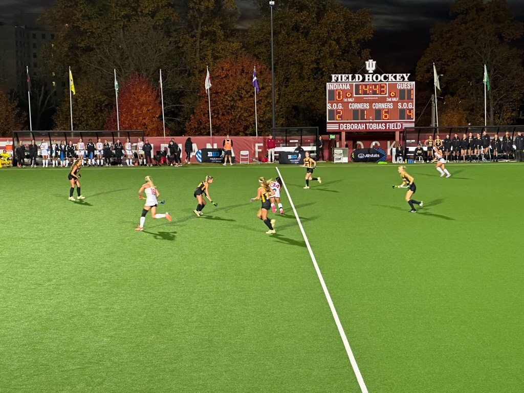Seedings in the Big Ten Field Hockey Tournament meant little this year. Except for the Northwestern Wildcats, who had a bye because they won the seasonal championship, the rest of the field were equal, as shown by the first two matches, where Michigan beat Rutgers 2-1 in a second overtime, and seventh seeded Ohio State beat second seeded Maryland 2-1. I had been at the pitch since late morning to watch these two matches, feeling rather conspicuous in my black and gold Hawkeye kit, and feeling a trifle hungry, having breakfasted early before I set out on a small tub of yoghurt and a minuscule bagel with olive oil. The venue made us plebs who weren’t Big Ten officials park more than a half mile away and at my age I didn’t feel like walking a mile and half to the car for a snack—next time I’ll pack my own food–the overpriced hot dogs and sodas at the Indiana concession stand had little appeal, and the fast would be good for my figure. And as the late autumn afternoon stretched into evening, it was time for our event, the encounter with Indiana. The Hawkeyes beat the Hoosiers twice last September (a weekend in Bloomington I skipped in person, though I wrote my reports from the online videos), but those were tough matches and subsequent Indiana victories over Maryland, Penn State, and Ohio State showed they were a strong team who would give us a good match.
